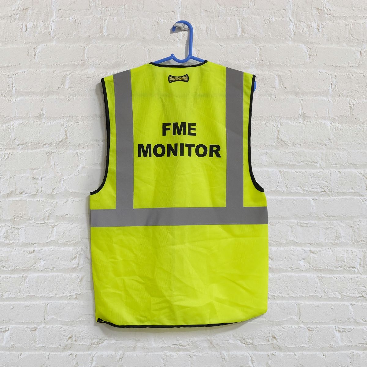 Vest, FME MONITOR, Class 2, Safety Vest, Yellow, 100% Polyester, No Zippers, Size Extra Large, Custom Products are Non-Cancellable/Non-Returnable.
