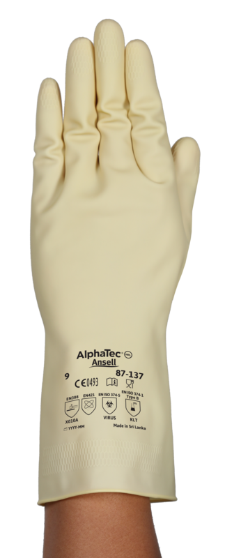 | 24596 | Ansell AlphaTec 87137 Rubber Synthetic Glove | GLOVES-NUCLEAR, SIZE 10 EXTRA LARGE, 12" LONG, LATEX MATERIAL, NATURAL COLOUR, RINGED, 300 DOZEN PAIRS / CONTAINER (TOTE), PPE |